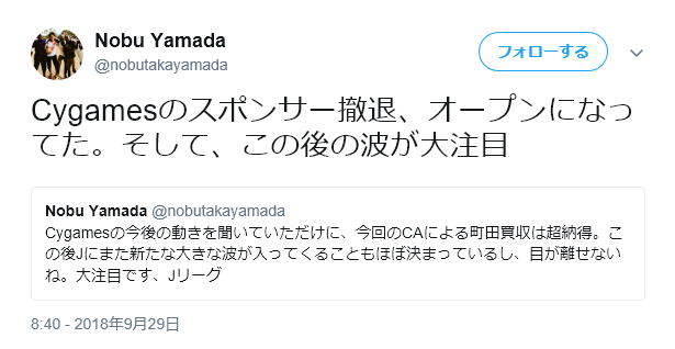 Cygamesの今後の動きを聞いていただけに、今回のCAによる町田買収は超納得。この後Jにまた新たな大きな波が入ってくることもほぼ決まっているし、目が離せないね。大注目です、Jリーグ