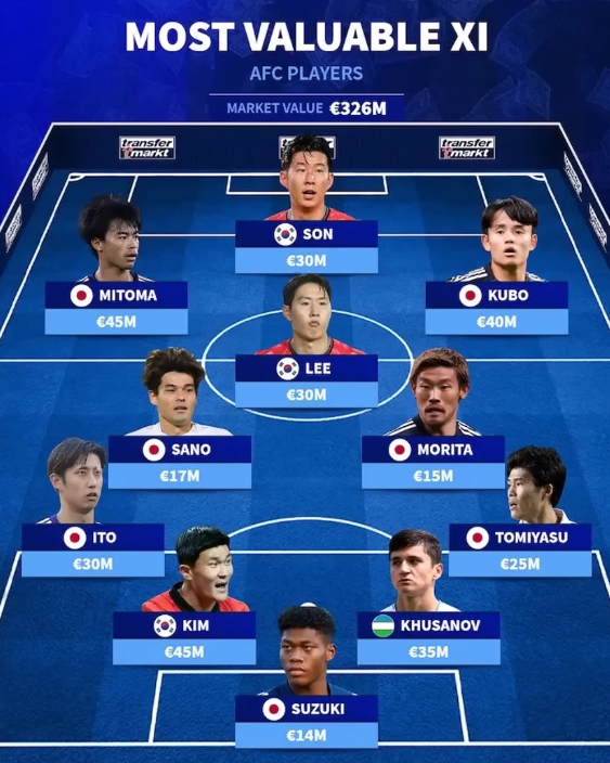 「ベスト11のうち7人が日本の選手だった。韓国代表の選手の中から選ばれたのは、キム・ミンジェ、イ・ガンイン、ソン・フンミンだけだ。イ・ガンイン、ソン・フンミンの市場価値は約3000万ユーロ(約48億円)と評価されている。キム・ミンジェは、三笘薫とともに、アジアの中でもっとも高い市場価値である約4500万ユーロ(約72億円)だった。日本と韓国を除いて唯一選ばれたのは、『ウズベキスタンのキム・ミンジェ』と呼ばれるフサノフだ。」