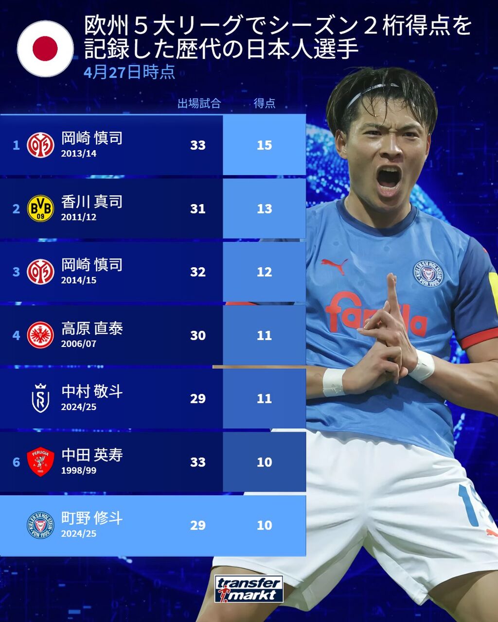 町野修斗1部初年度 (25)31試合11ゴール2アシスト 降格キール