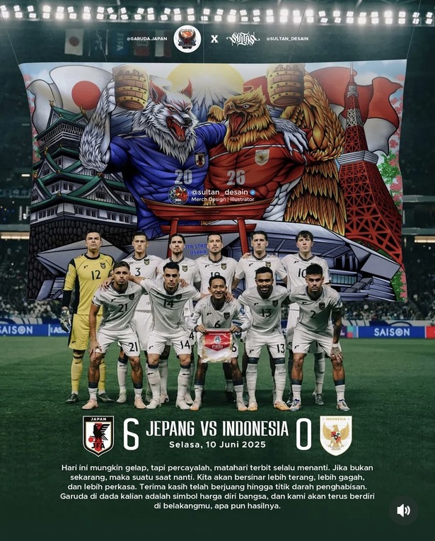 巨大旗には東京タワー、安芸の宮島、富士山、大阪城など日本の名所が描かれた。また、日本代表の青いユニホームを着た白いオオカミと、インドネシアの赤いユニホームを鳥の王(ガルーダ)が肩を組んでいる