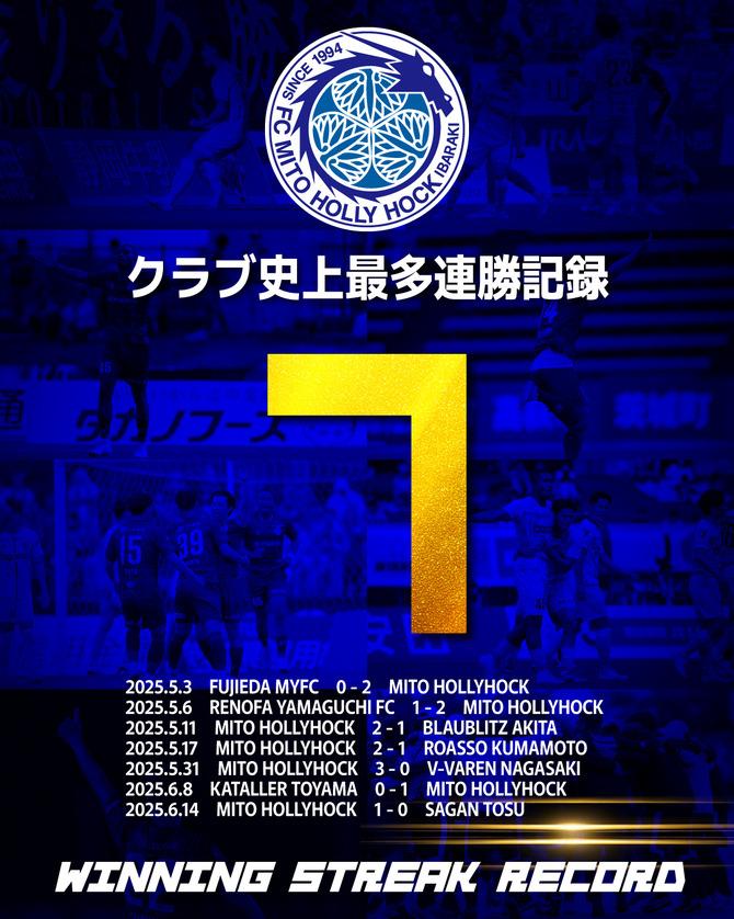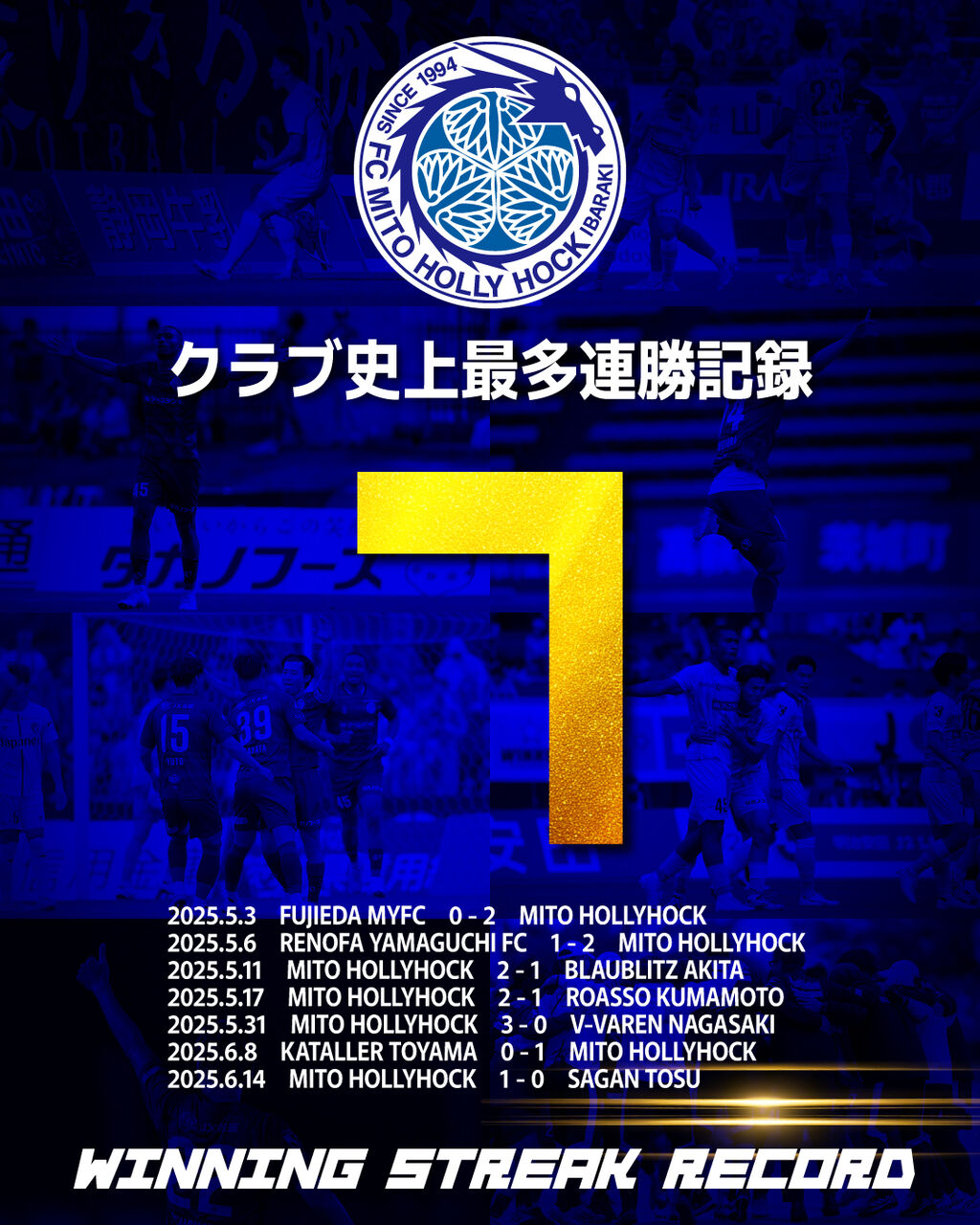 サッカーJ2の水戸ホーリーホックは本日、ホームのケーズデンキスタジアム水戸でサガン鳥栖と対戦し、1-0で勝利した。 この結果、水戸はリーグ戦新記録の7連勝で勝ち点38となり、勝ち点37の千葉を上回って首位となった。 水戸は次節、アウェイで今治と対戦する。