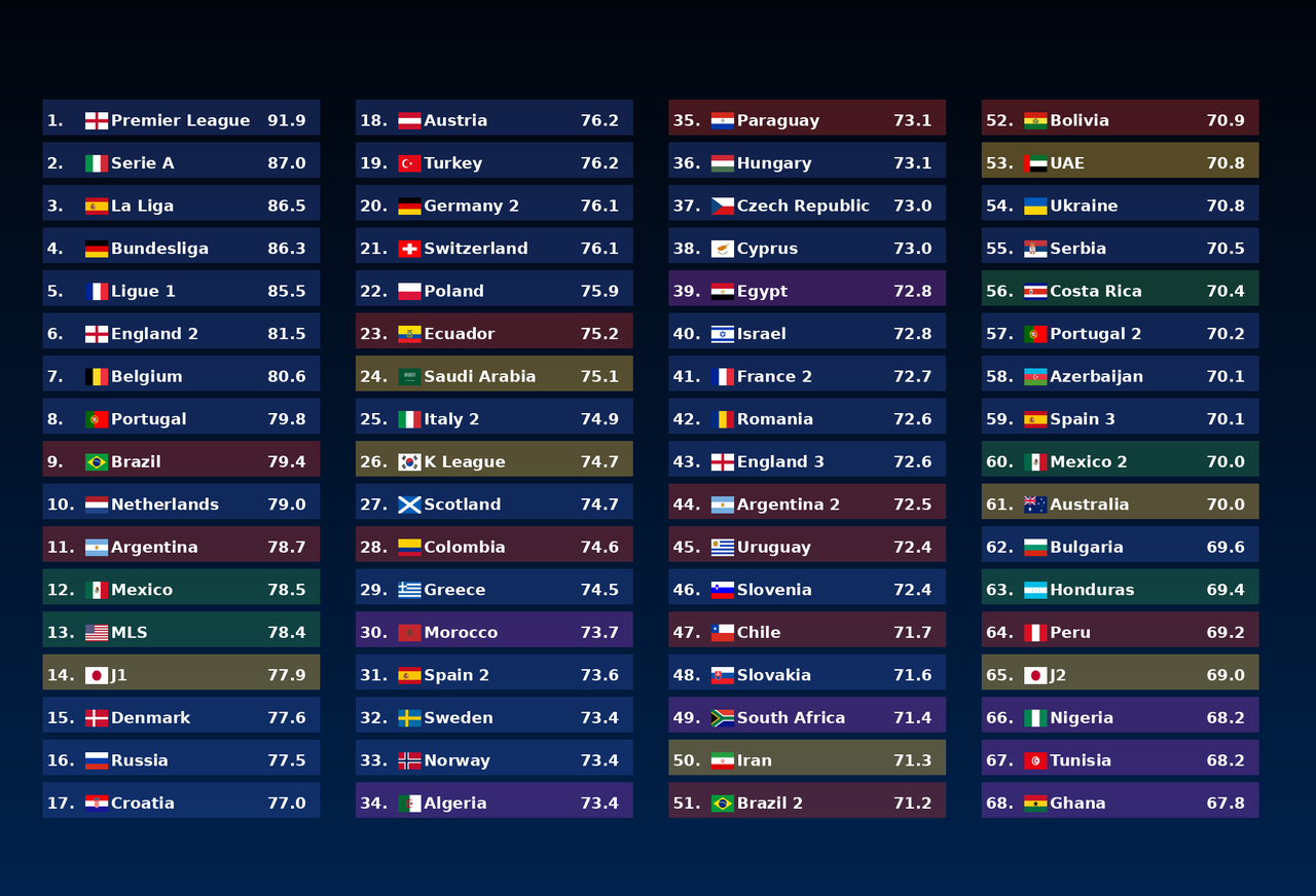 最新のOptaパワーランキングだとJ1が世界14位らしいな