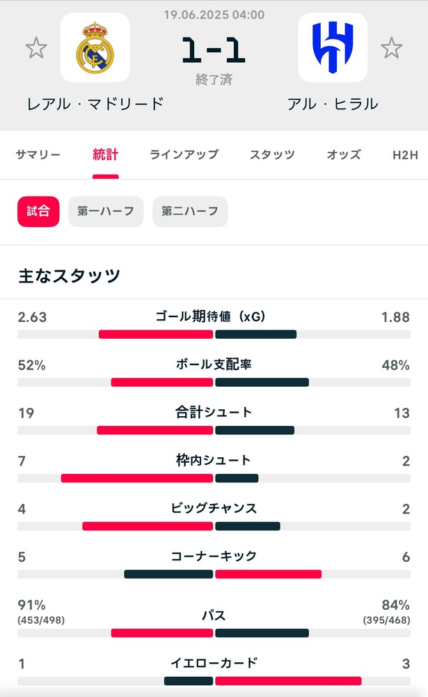 結局、そのまま試合は1-1で終了。互いに痛み分けの結果となった。次節は22日に行われ、レアル・マドリードはパチューカ(メキシコ)と対戦。アル・ヒラルはザルツブルク(オーストリア)と対戦する。