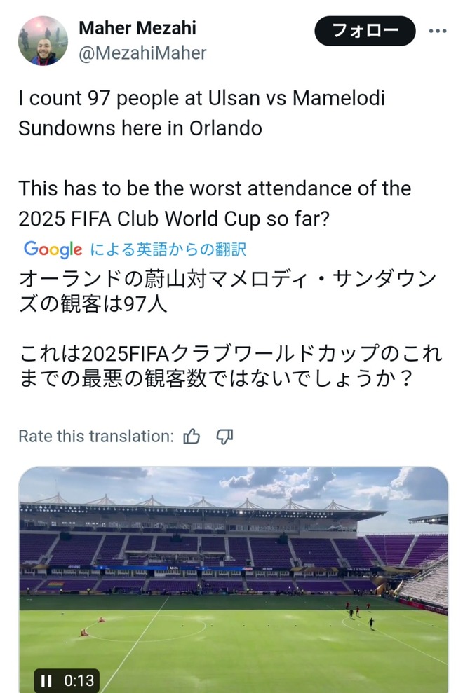 【悲報】サッカークラブワールドカップ、衝撃の観客数97人wwwwwwww