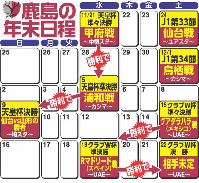 21日の天皇杯準々決勝から再び過密日程が始まるが、クラブW杯で初戦のグアダラハラ(メキシコ)を下せば欧州王者・レアルマドリードとの再戦だ。16年大会は決勝で対戦、準決勝の得点時に“C・ロナポーズ”を披露した鈴木は、「何と言っても相手がレアル。誰もが待ち望んだようなシチュエーション」と胸を高鳴らせた。さらに、「鹿島は一発勝負で尋常じゃない力を発揮するんで。みんなも知っているようにね」。アジア制覇で終わりじゃない。金髪の点取り屋は世界との対戦に向け、牙を研いでいる。