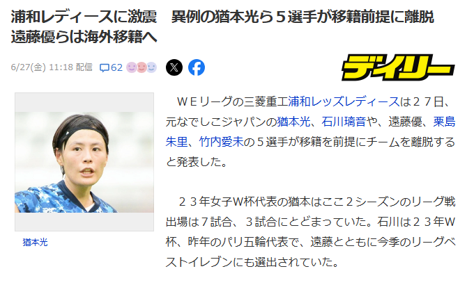WEリーグの三菱重工浦和レッズレディースは27日、元なでしこジャパンの猶本光、石川璃音や、遠藤優、栗島朱里、竹内愛未の5選手が移籍を前提にチームを離脱すると発表した。