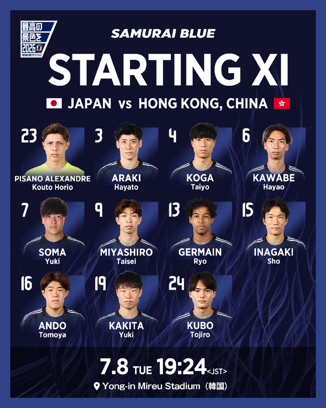 EAFF E-1選手権を戦う日本代表は8日、韓国・龍仁ミルスタジアムで行われる初戦で香港代表と対戦する。午後7時24分のキックオフを前にスターティングメンバーが発表され、GKピサノアレックス幸冬堀尾(名古屋)、DF安藤智哉(福岡)、MF久保藤次郎(柏)、FW宮代大聖(神戸)、FWジャーメイン良(広島)、FW垣田裕暉(柏)にの6選手が先発でA代表デビューを果たす。