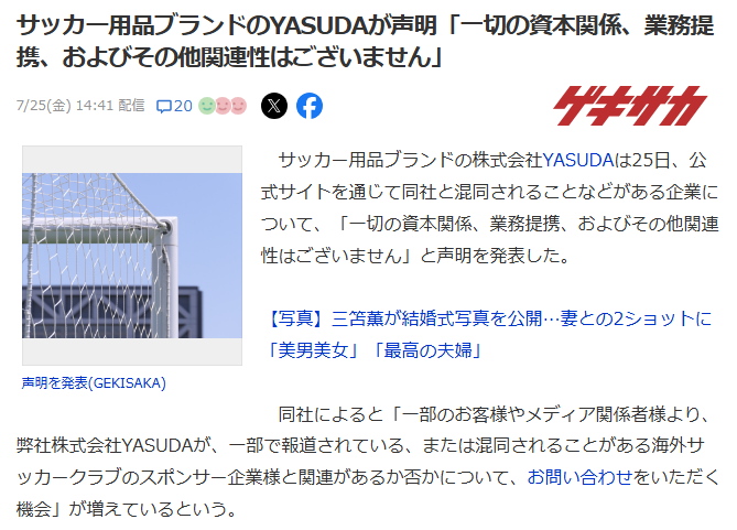 サッカー用品ブランドの株式会社YASUDAは25日、公式サイトを通じて同社と混同されることなどがある企業について、「一切の資本関係、業務提携、およびその他関連性はございません」と声明を発表した。