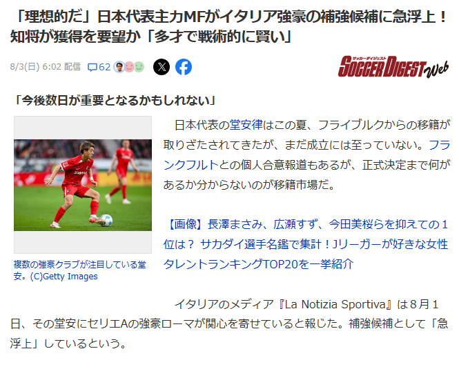 堂安律がイタリア強豪ローマの補強候補に急浮上 監督が獲得を要望か