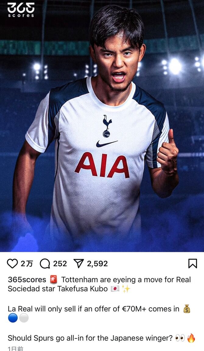 「次なる標的として」久保建英の獲得に本腰?トッテナムがトップターゲット獲得失敗で「十分な資金が残っている」https://news.yahoo.co.jp/articles/2bd5684229c73bc1718ce864b2bfd840556ac66f