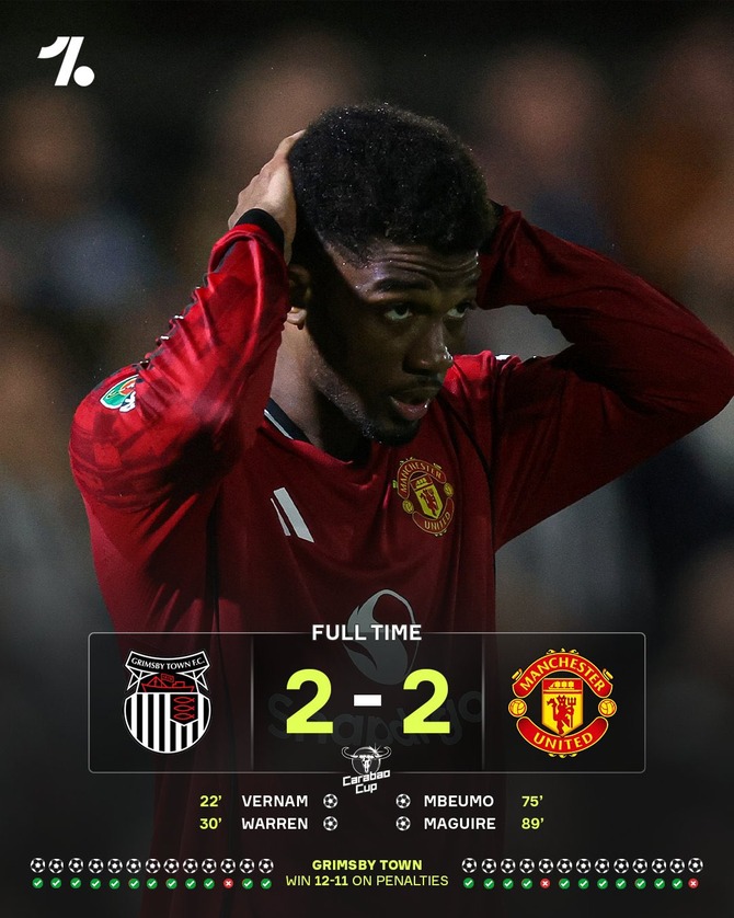 現地8月27日に開催されたカラバオカップの2回戦で、マンチェスター・ユナイテッドが4部のグリムズビーと対戦。PK戦の末に敗れ、まさかの敗退となった。