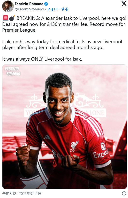 速報:アレクサンダー・イサクがリヴァプールへ移籍!移籍金1億3000万ポンドで合意。プレミアリーグ史上最高額の移籍。