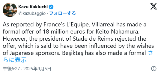 Villarreal has made a formal offer of 18 million euros to Keito Nakamura. However, the president of Stade de Reims has rejected the offer due to the wishes of their Japanese sponsors.