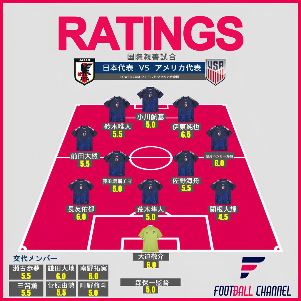 荒木隼人 5.0 前に出るも潰しきれないという場面がちらほら。世界とのレベル差を痛感か