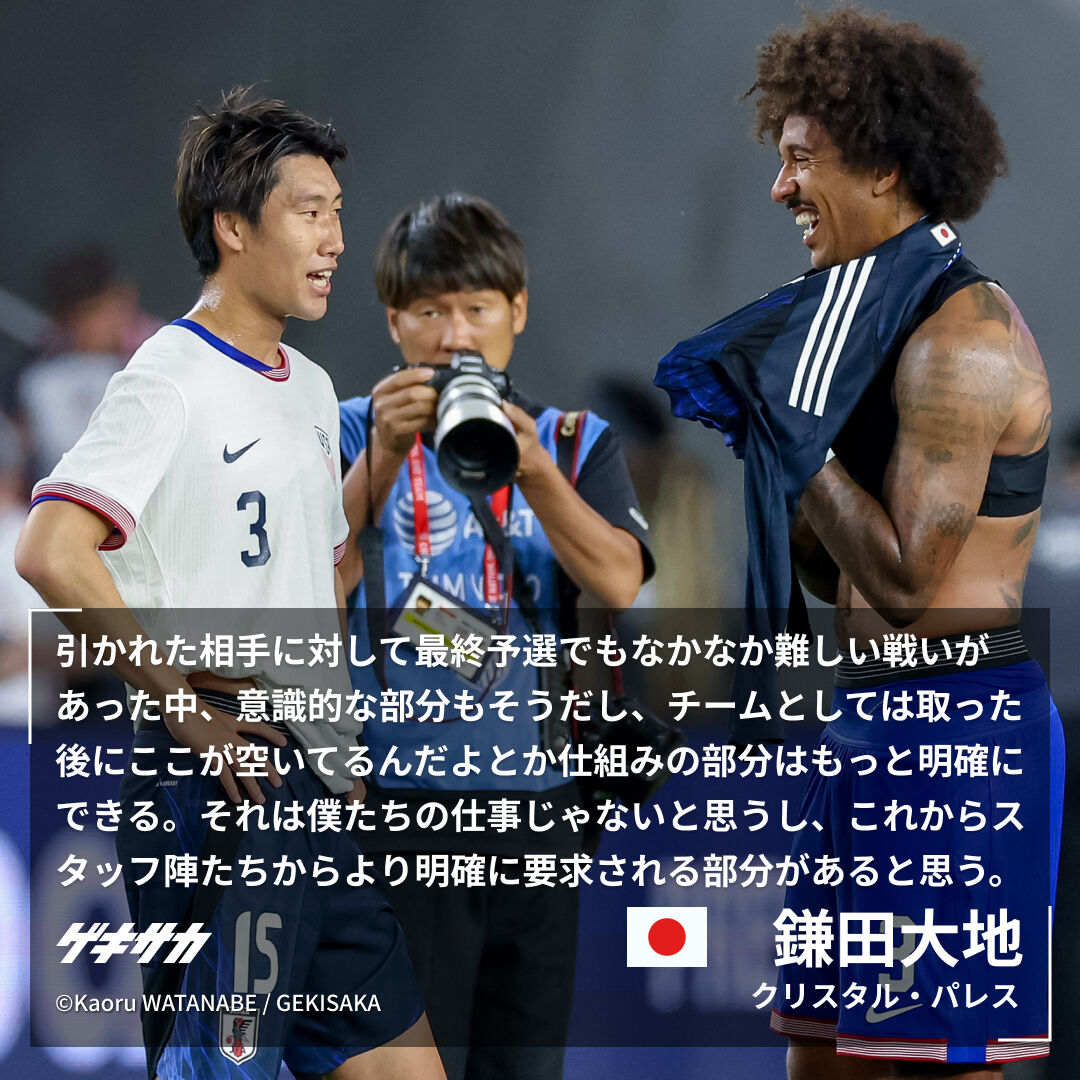 鎌田は「引かれた相手に対して最終予選でもなかなか難しい戦いがあったなか、意識的な部分もそうだし、チームとしては取った後にここが空いてるんだよとか仕組みの部分はもっと明確にできる」と次のステップを提示。「それは僕たちの仕事じゃないと思うし、これからスタッフ陣たちからより明確に要求される部分があると思う。次の代表合宿からそれを取り組んでいかないといけない」と首脳陣からの具体的な指示に期待し、10月を見据えていた。