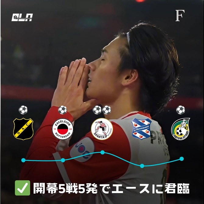 フェイエノールトリーグ単独1位 上田綺世リーグ得点同率1位