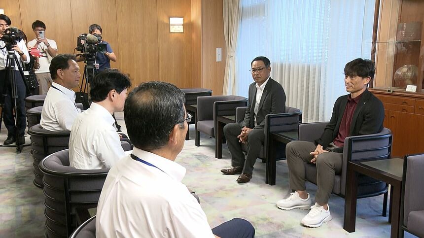 サッカー元日本代表で現在は日本サッカー協会の会長を務める宮本恒靖さんが、岡山県の新スタジアム建設などについて議論しようと、伊原木知事を表敬訪問しました。