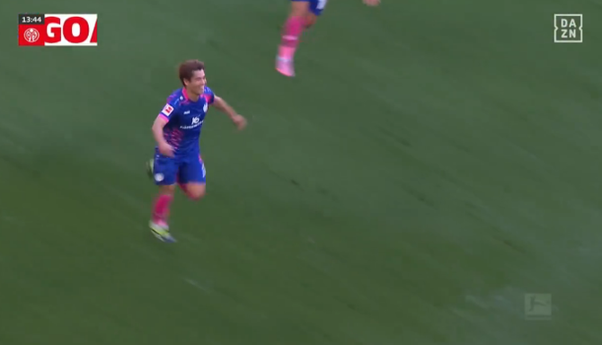 すると14分、佐野が結果を残した。佐野が中盤でパスをインターセプトすると、そのままボックス手前までドリブルでボールを持ち運び、左足を一閃。低い弾道のミドルシュートはゴール右隅に突き刺さった。佐野にとって、マインツに移籍して初のゴールとなった。