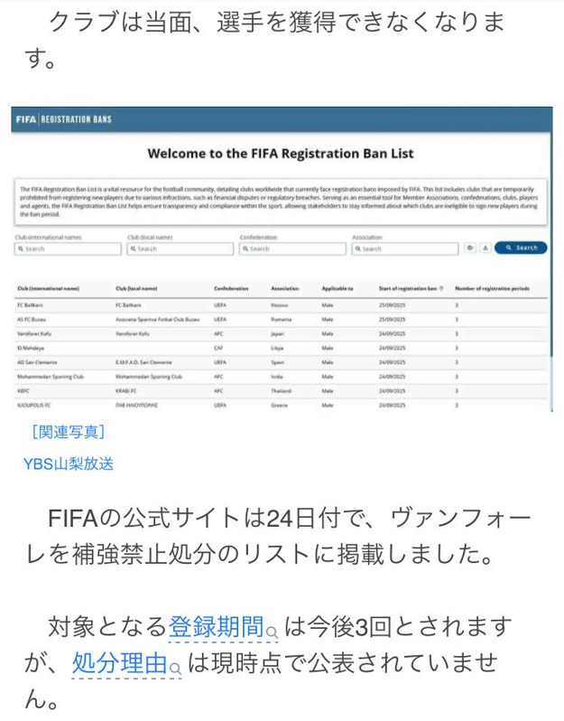 国際サッカー連盟(FIFA)がJ2ヴァンフォーレ甲府に補強禁止処分を科したことが明らかになった。24日付で登録禁止リストに掲載されている。