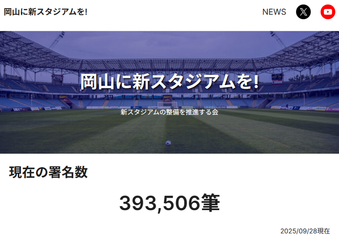 サッカーJ1、ファジアーノ岡山の新スタジアムの整備を求める署名活動では9月27日までに約38万人分が集まり、広島の新スタジアムが検討される際に提出された署名の数を上回りました。