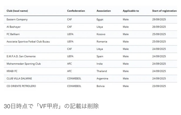 この問題はブラジルのトンベンセFCに対して、ヴァンフォーレが期限付き移籍した選手の契約期間の延長分の移籍金を払っていないと、FIFAから指摘を受けたもので、FIFAの公式サイトの補強禁止処分リストに今月24日付で掲載されました。