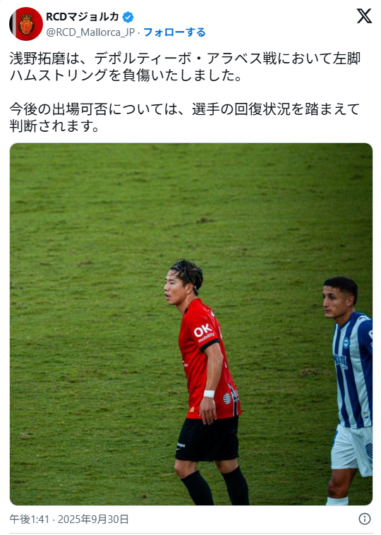 RCDマジョルカ@RCD_Mallorca_JP 浅野拓磨は、デポルティーボ・アラベス戦において左脚ハムストリングを負傷いたしました。