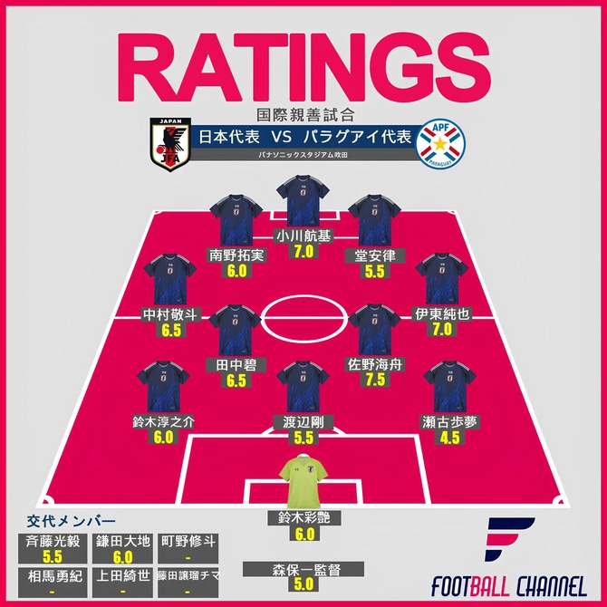 サッカー日本代表は10日、キリンチャレンジカップ2025(国際親善試合)でパラグアイ代表と対戦し2-2でドロー。この試合で、森保ジャパンのパフォーマンスはどうだったのだろうか。パラグアイ戦に出場した選手(出場時間の短い選手は除く)、監督のパフォーマンスをどこよりも早く採点する。