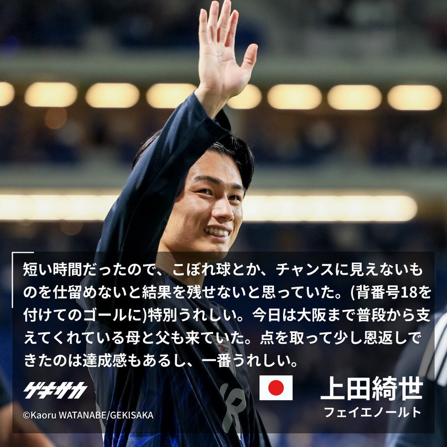苦しむチームを救ったのは途中出場のエースだった。日本代表FW上田綺世(フェイエノールト)は試合後のフラッシュインタビューで「チャンスを逃さないように意識していた」と語った。