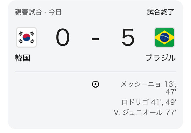 現地10月10日に開催された国際親善試合で、韓国代表がブラジル代表と対戦。0-5の大敗を喫した。