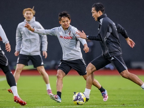 選手たちはウォーミングアップを行った後、5対5+フリーマン2人のミニゲームなどで調整。久保とMF鎌田大地(クリスタル・パレス)がフリーマンを務め、ミニコートの中で素早い判断でパスをつなぐメニューとなった。その後、久保が全体練習を離れ、残りの選手でシュート練習や、より広いコートでの5対5+フリーマン1人のミニゲームを実施。1時間超にも及ぶ濃密なトレーニングとなった。
