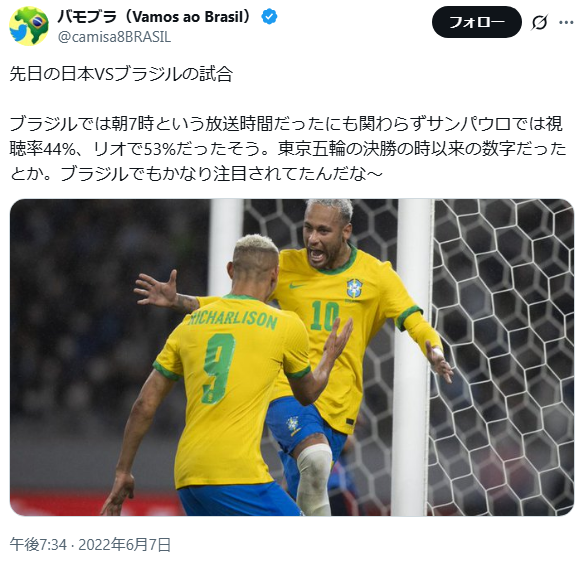 ブラジルでの日本戦の視聴率は朝7時なのにサンパウロで44%、リオでは53%だった模様
