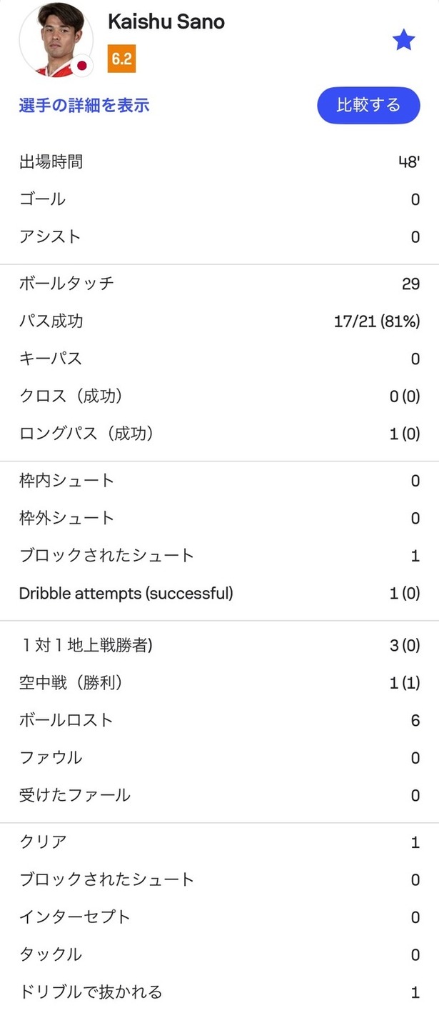 【悲報】佐野海舟、最低点…(GK以外)。デュエル全敗ロスト多数。過大評価だった… #サッカー日本代表 ブラジル戦
