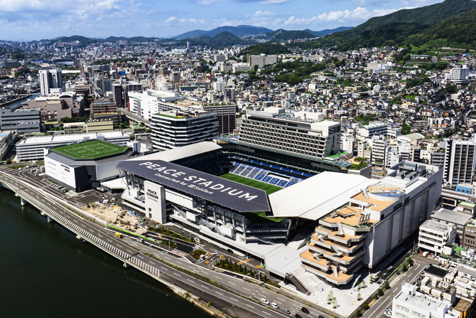 同施設は中核のサッカー競技場「ピーススタジアム」(2万人収容)や商業施設、ホテルなどがあり、ジャパネットHDが総額約1000億円を投じて昨年10月14日に開設した。