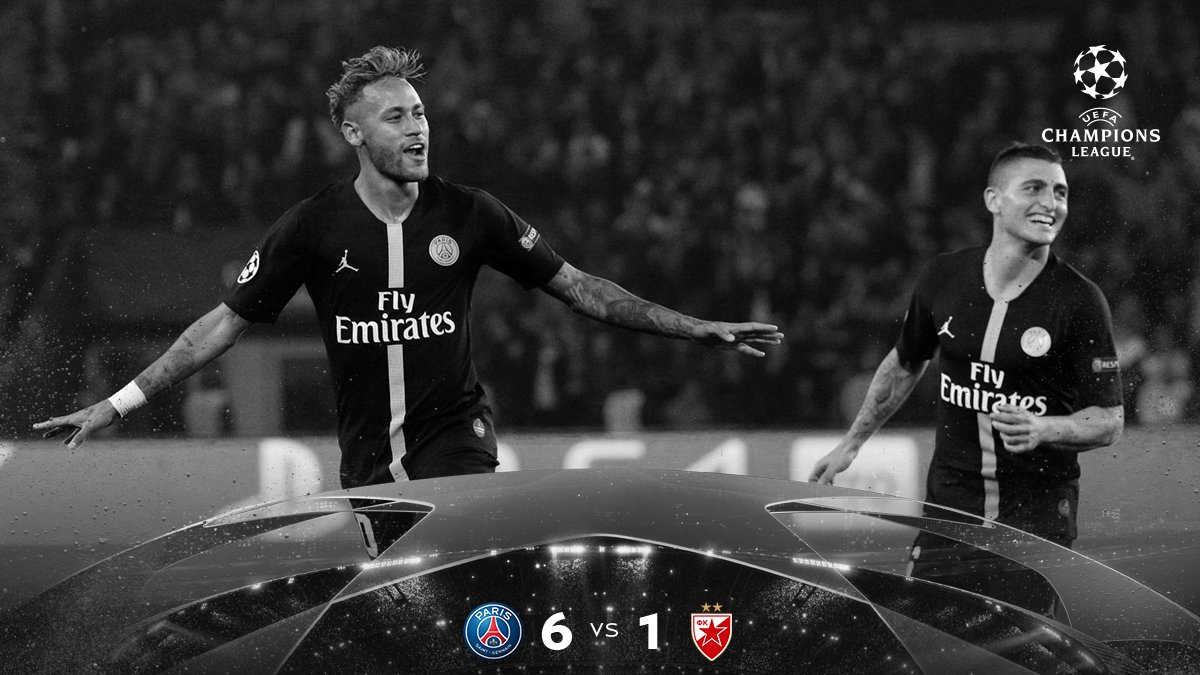 チャンピオンズリーグ(CL)・グループステージ第2節が3日に行われ、パリ・サンジェルマン(PSG)とツルヴェナ・ズヴェズダが対戦した。20分にネイマールが直接フリーキックを叩き込んでPSGが先手を取ると、続く22分にはキリアン・ムバッペのパスをネイマールが押し込み点差を広げる。その後もエディンソン・カバーニ、アンヘル・ディ・マリア、ムバッペがゴールを挙げて試合を決定付ける。74分にマリンのゴールで1点を返されるも、81分には再びネイマールがフリーキックを沈め、最終的にスコアは6-1に。PSGが今季のCLで初白星を手にした。