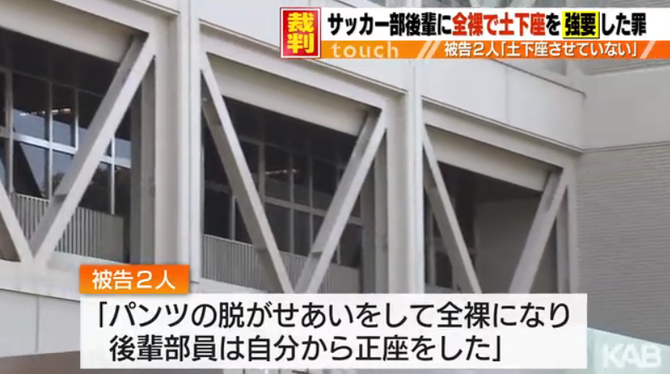 22日の被告人質問で2人は「パンツの脱がせあいをして全裸になり、後輩部員は自分から正座をした」などと話し「土下座はさせていない」と主張しました。